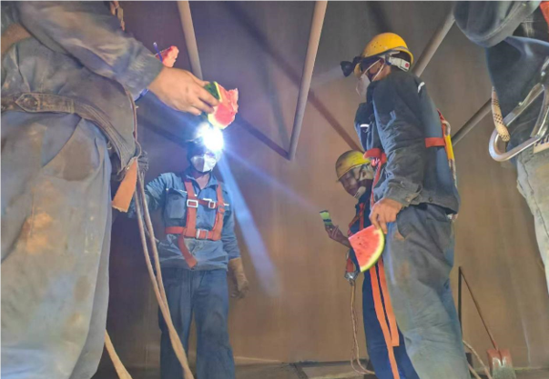 8月13日,球團(tuán)脫硫脫硝系統(tǒng)定期檢修,檢修工作地點(diǎn)多數(shù)在室外,高溫天氣和高強(qiáng)度工作量更是加大了人員中暑的風(fēng)險。下午4點(diǎn)氣溫達(dá)到了33度,后勤人員帶著切好的冰凍西瓜來到檢修現(xiàn)場,把清涼送到每個區(qū)域,也送到了39米高的濕電頂部。