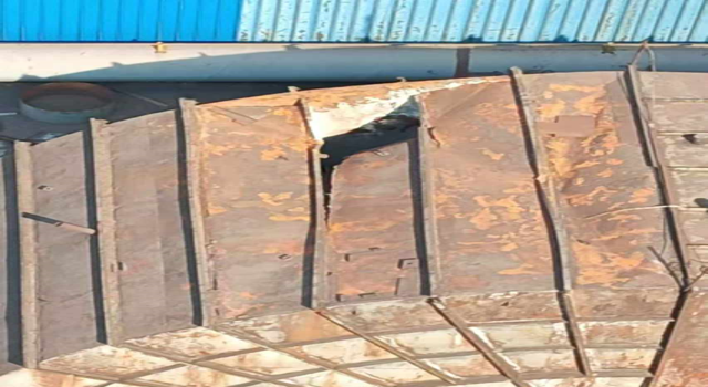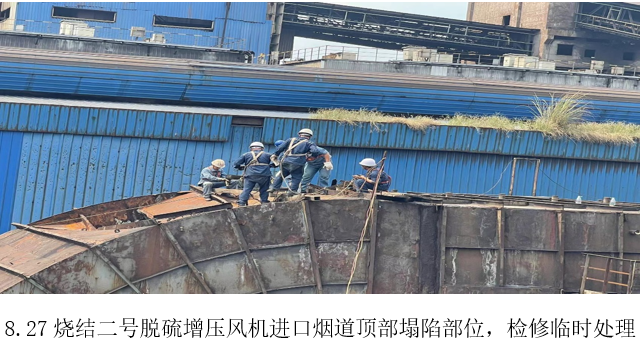 8月27日,檢修員在巡檢時發(fā)現(xiàn)并上報了燒結二號脫硫增壓風機進口煙道頂部約27㎥鋼板出現(xiàn)塌陷,威遠藍鼎生產(chǎn)部高度重視,立即將風險隱患上報燒結廠部領導,協(xié)商時間處理。當天廠部協(xié)商停機4小時對脫落部位進行臨時加固處理。8月28日,廠部利用高溫限電停機11小時,對二號燒結進口煙道頂部脫落位置進行全面檢修。