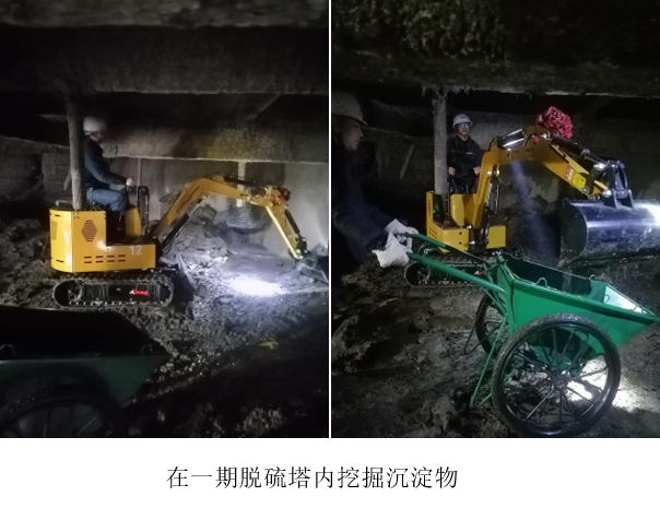 1月27日,西昌藍鼎在一期脫硫塔維護工作中引入微型挖掘機,成功攻克了長期困擾脫硫塔底部沉淀物清理的難題。